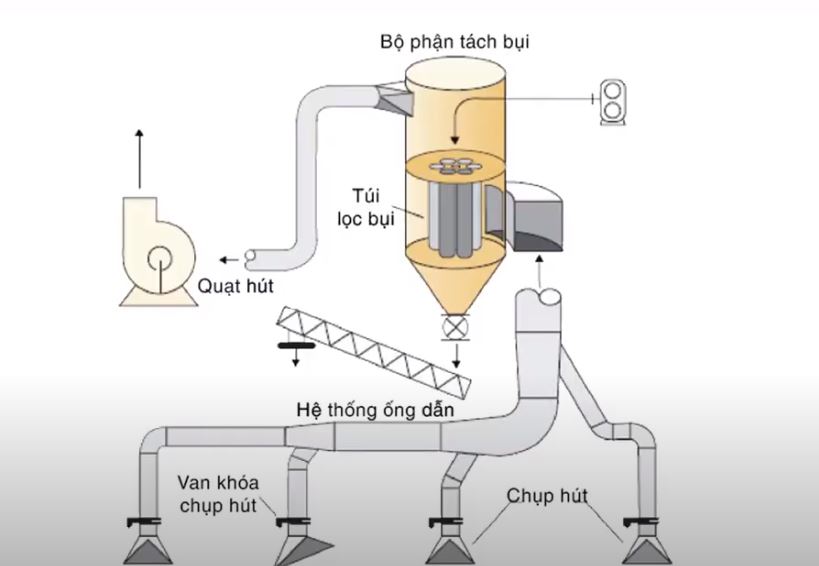 - Hệ thống ống dẫn: Dẫn luồng khí đem theo bụi từ các chụp hút đi đến bộ phận tách bụi