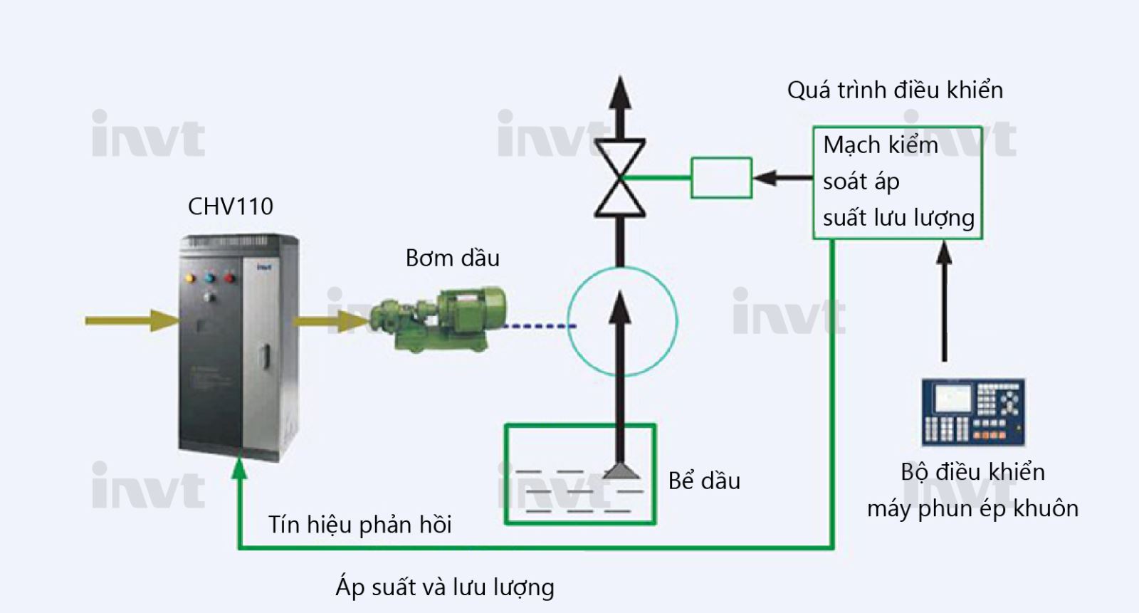 - Sử dụng 1 biến tần CHV110 có công suất bằng hoặc lớn hơn công suất của động cơ bơm dầu.