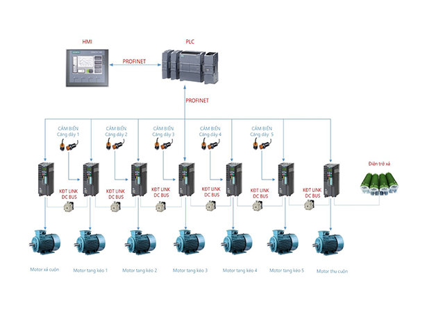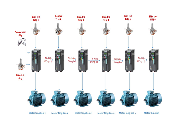 Đối với dòng máy kéo thép liên hoàn bù cơ, giải pháp của Hoàng Gia Automation sử dụng biến tần INVT GD200A, biến tần GD20 hoặc biến tần Siemens G120, Siemens G120C chạy đồng bộ cùng cấp, gồm có 1 biến trở điều chỉnh tốc độ tổng và mỗi biến tần sau có 1 biến trở tinh chỉnh nhằm điều chỉnh tốc độ phù hợp cho từng tang kéo.