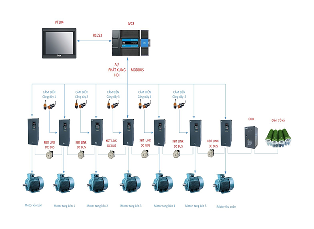 Đối với dòng máy liên hoàn bù cơ tự động sử dụng thiết bị INVT, giải pháp đưa ra là kết hợp bộ điều khiển PLC, HMI và biến tần INVT với sensor căng chùng trên mỗi biến tần dây giúp cho sợi dây luôn được căng tự động mà không bị căng quá mức cũng không bị chùng quá mức.