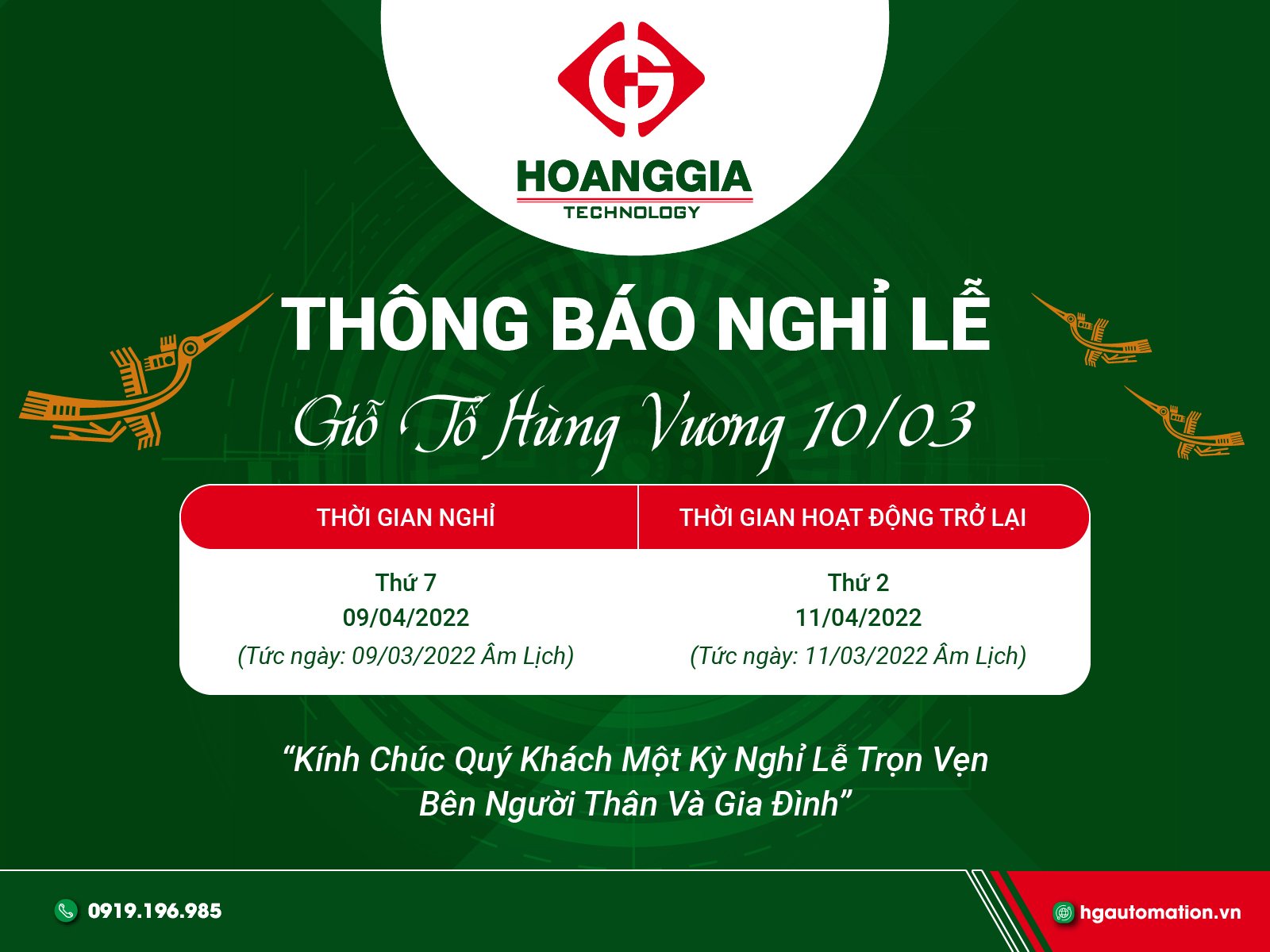 Hoàng Gia Automation thông báo lịch nghỉ lễ Giỗ Tổ Hùng Vương năm 2022