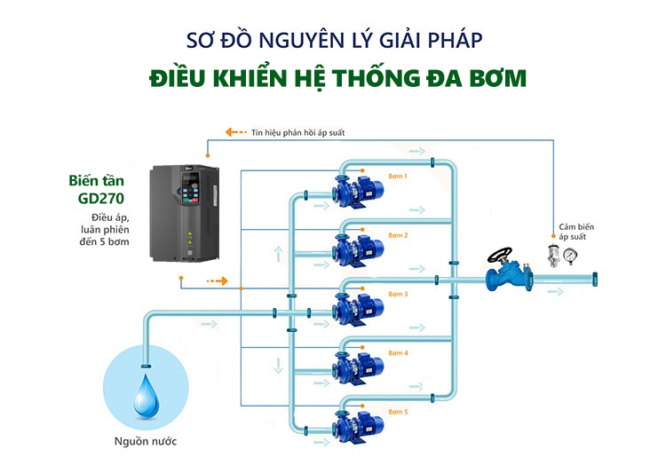 Biến tần INVT GD270 nhận tín hiệu đầu vào từ cảm biến áp suất gắn trên đường ống chính. Dựa vào tín hiệu phản hồi, GD270 sẽ tự động điều chỉnh tần số và từ đó điều khiển tốc độ động cơ bơm sao cho áp suất đầu ra luôn duy trì ổn định theo giá trị cài đặt (PID).
