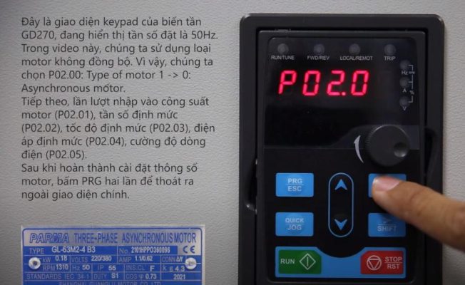 Bước 2: Lần lượt nhập vào công suất motor  P02-01, tần số định P02.02, tốc độ định mức P02-03, điện áp định mức P02-04, cường độ dòng điện P02-05.