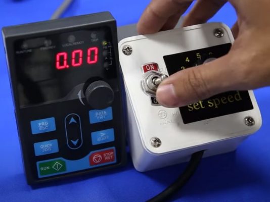 Bước 3: Sau khi cài đặt xong, chúng ta cho biến trở về 0 và bật ON trên hôp công tắc để chạy motor.