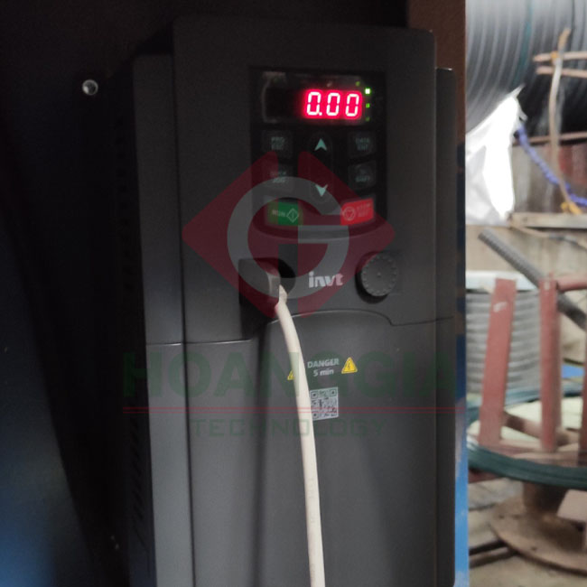 Sau khi nhận được yêu cầu sửa chữa của công ty khách hàng, kỹ thuật viên Hoàng Gia Automation đã tiến hành kiểm tra và phát hiện biến tần cũ của máy bị chập chờn tần số, báo lỗi liên tục khiến cho máy phải dừng. Vì đây là biến tần cũ, hiện nay đã dừng sản xuất, việc thay thế và tìm linh kiện mất nhiều thời gian, nên kỹ thuật Hoàng Gia Automation đã tiến hành thay thế sang biến tần INVT GD200A cùng công suất 11kW, upload chương trình điều khiển của hệ thống và chạy thử hiệu chỉnh.